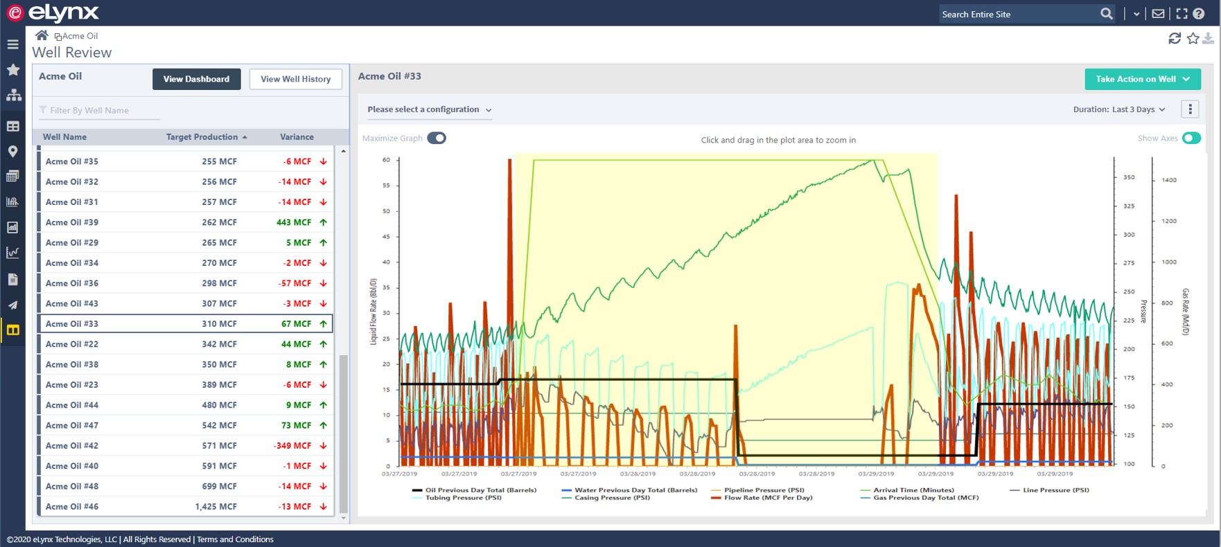 Engineers are saving hours each day previously spent toggling between multiple applications and scrolling through rows of data. They are leveraging the eLynx Data Historian to combine data from multiple systems to look for well conditions at scale. The eLynx Data Historian provides engineers with a Rules Engine, allowing them to capture complex criteria and conditions in a single platform, then displaying the results in a Production Dashboard drawing awareness to only the wells needing immediate attention.